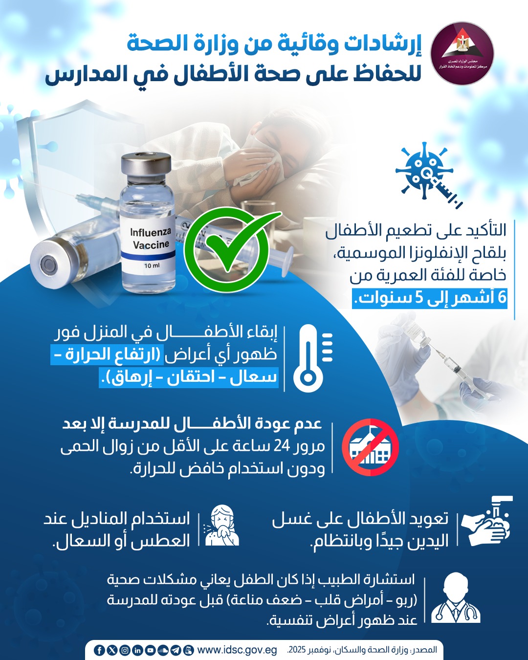 - التأكيد على تطعيم الأطفال بلقاح الإنفلونزا الموسمية خاصة للفئة العمرية من 6 أشهر إلى 5 سنوات.