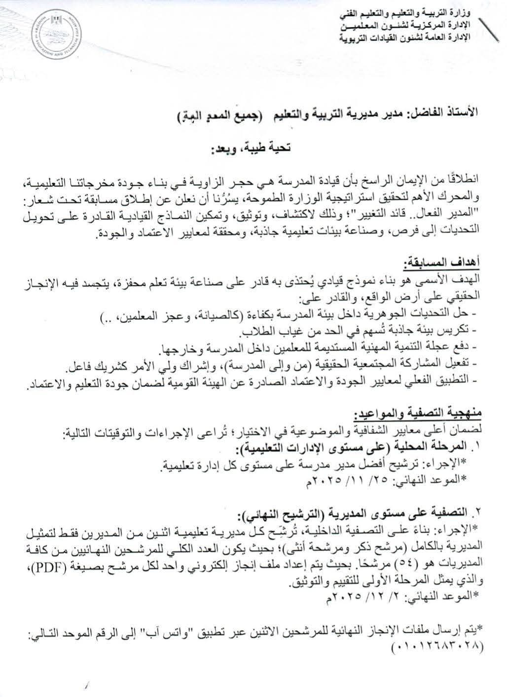 تأتي هذه المسابقة تأكيدًا لإيمان وزارة التربية والتعليم والتعليم الفني بقيادة محمد عبداللطيف بأن المدرسة تبدأ بقيادة قوية… وأن المدير المتميز هو نقطة الانطلاق نحو تعليم عالي الجودة.