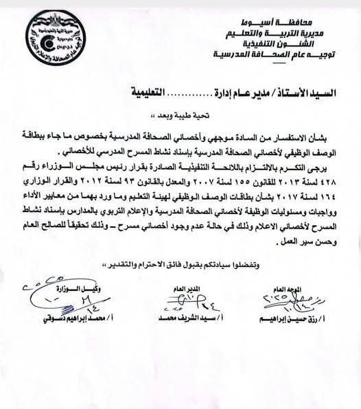 وشددت وزارة التربية والتعليم، في خطابها المديريات التعليمية، بضرورة الالتزام باللائحة التنفيذية الصادرة بقرار رئيس مجلس الوزراء رقم ٤٢٨ لسنة ۲۰۱۳ للقانون ۱۵۰ لسنة ۲۰۰۷ والمعدل بالقانون ۹۳ لسنة ۲۰۱۲ والقرار الوزاري ١٦٤ لسنة ٢٠١٧ بشأن بطاقات الوصف الوظيفي لهيئة التعليم وما ورد بهما من معايير الأداء وواجبات ومسئوليات الوظيفة لأخصائي الصحافة المدرسية والإعلام التربوي بالمدارس بإسناد نشاط المسرح الأخصائي الإعلام وذلك في حالة عدم وجود أخصائي مسرح – وذلك تحقيقًا للصالح العام وحسن سير العمل.