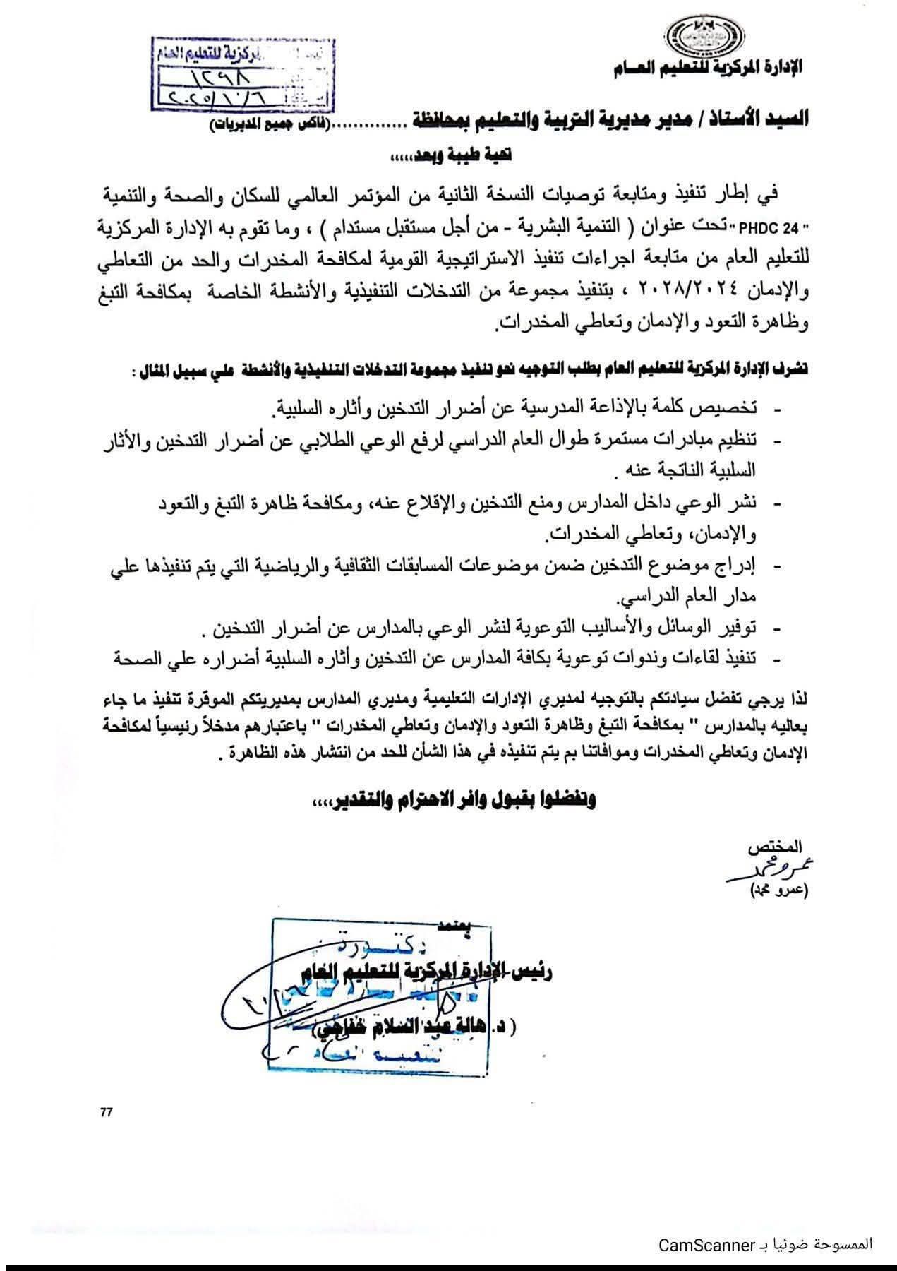 ووجهت مديري الإدارات التعليمية ومديري المدارس بـ تنفيذ ما جاء بعاليه بالمدارس ” بمكافحة التبغ وظاهرة التعود والإدمان وتعاطي المخدرات ” باعتبارهم مدخلًا رئيسيًا لمكافحة الإدمان وتعاطي المخدرات وموافاتنا بم يتم تنفيذه في هذا الشأن للحد من انتشار هذه الظاهرة.