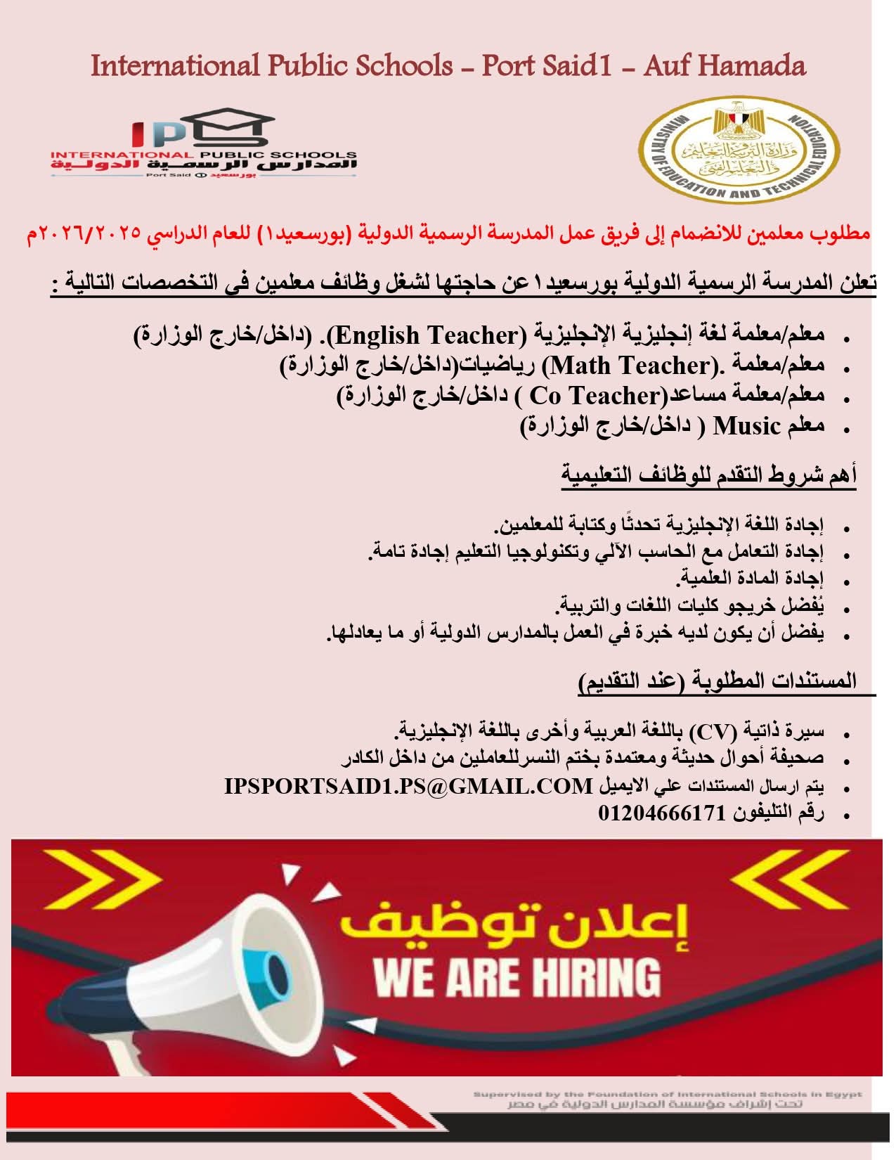 أعلنت المدرسة الرسمية الدولية في بورسعيد عن حاجتها لشغل وظائف معلمين للعام الدراسي الجاري 2025/2026 في التخصصات التالية: