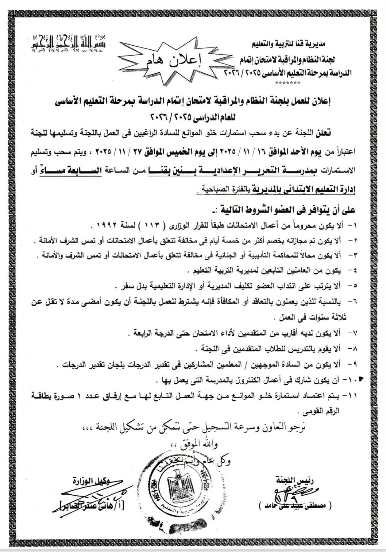أعلنت لجنة النظام والمراقبة لامتحانات الشهادة الإعدادية، بدء سحب استمارات خلو الموانع لـ الراغبين في العمل باللجنة وتسليمها للجنة اعتبارًا من يوم الأحد الموافق ١٦ / ۱۱ / ۲۰۲۵ إلى يوم الخميس الموافق ۲۷ / ۱۱ / ۲۰۲۵.