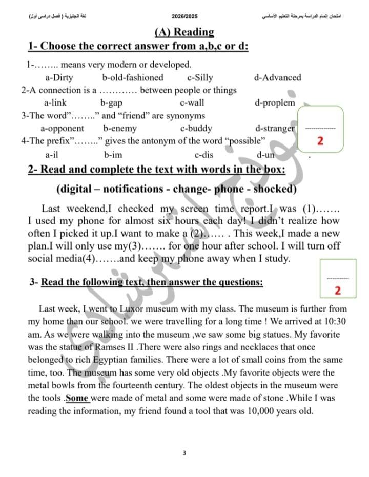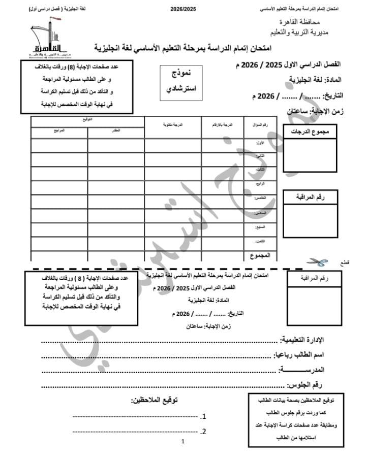 نشرت مديرية التربية والتعليم والتعليم الفني بمحافظة القاهرة نماذج استرشادية لامتحان اللغة الإنجليزية لطلاب الشهادة الإعدادية للعام الدراسي الحالي 2025 – 2026.