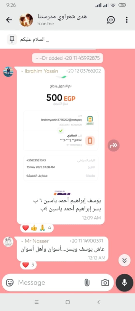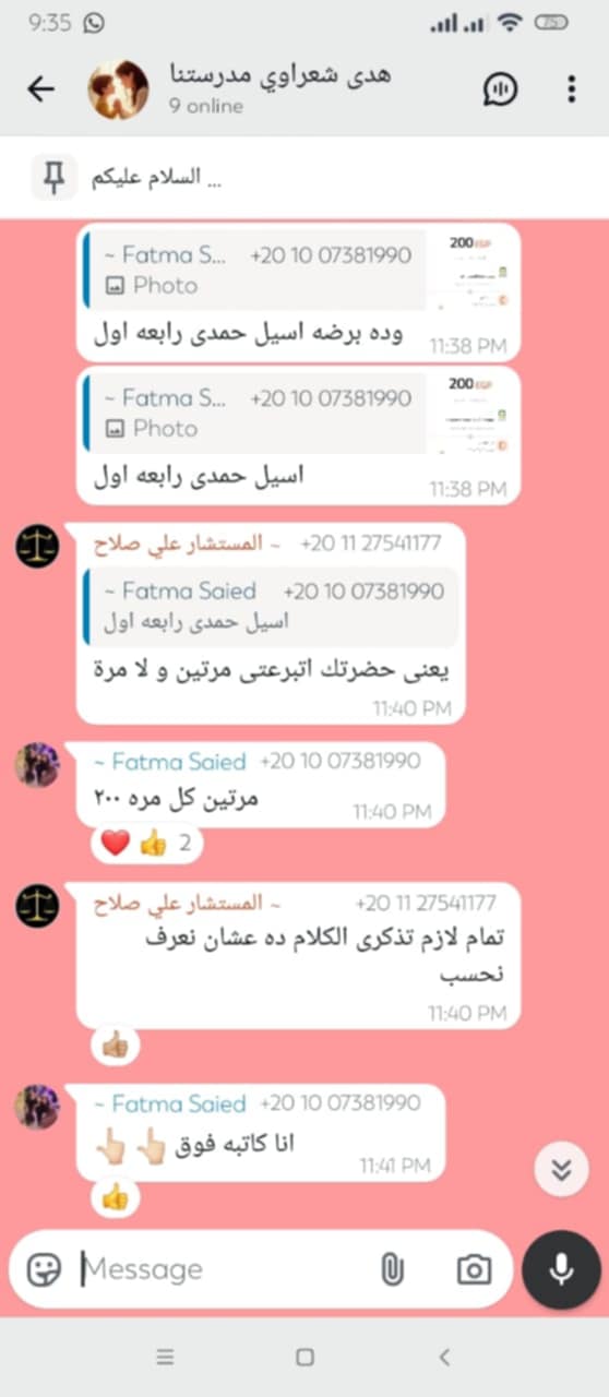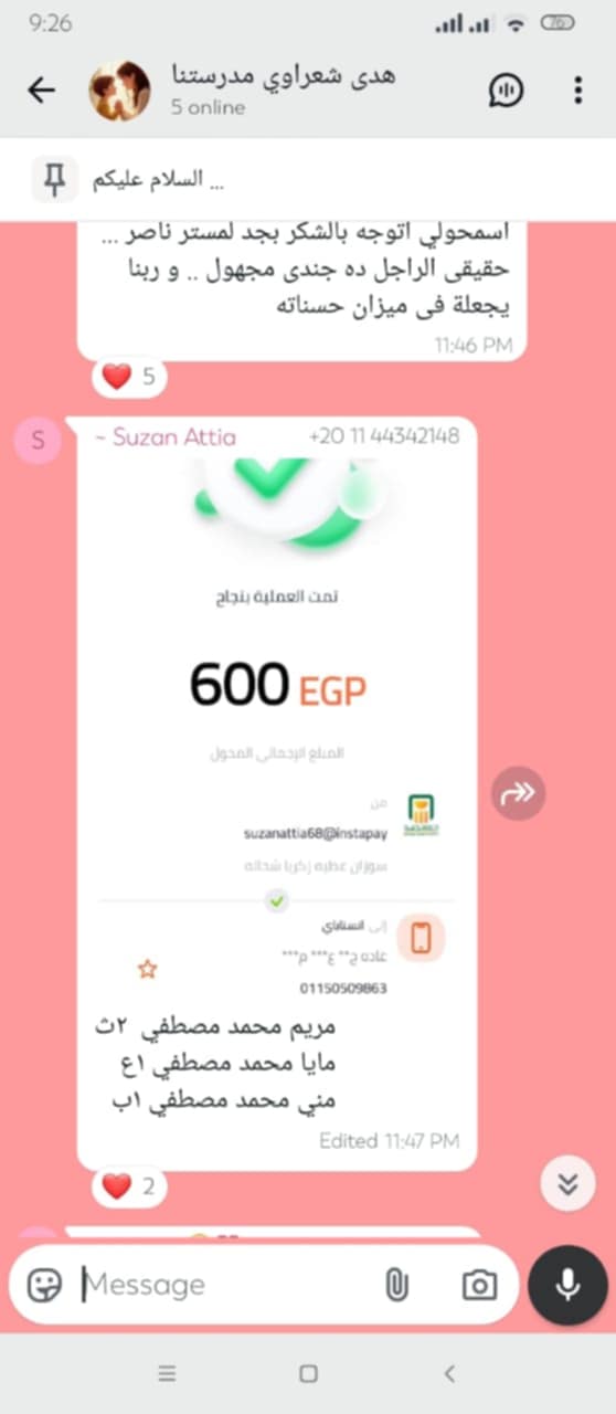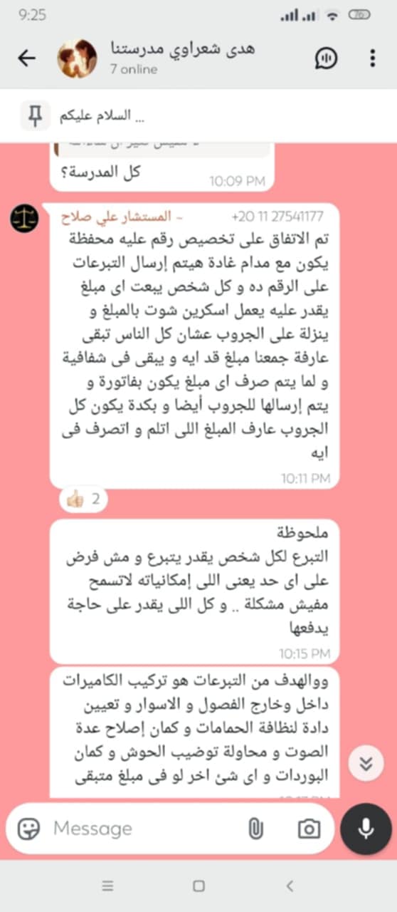 وفوجئ أولياء الأمور بإنشاء مجموعة باسم “هدى شعراوي مدرستنا” لجمع الأموال باسم الطالب وصفه، وتواجد معلم اللغة الإنجليزية بالمدرسة داخل المجموعة لحث أولياء الأمور على الدفع.