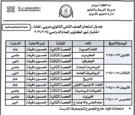 جدول امتحانات شهر أكتوبر ثانية ثانوي محافظة أسوان 2026