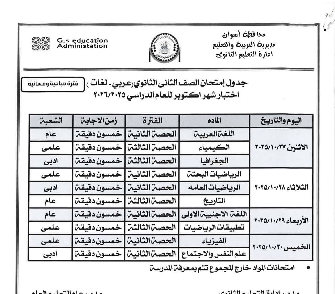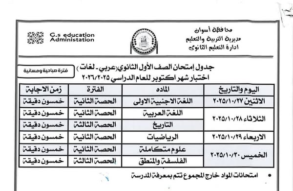 أما جدول امتحان الصف الثاني الثانوي (عربي_ لغات) بشهر أكتوبر 2025 بمحافظة أسوان، فجاء كالآتي: