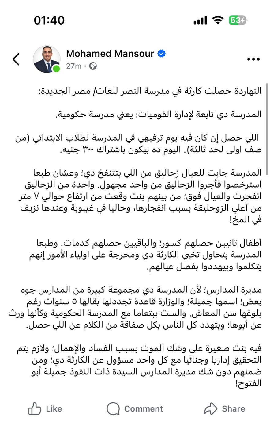 وقد كشف منشور متداول على فيسبوك عن حادث مدرسة النصر للغات بمصر الجديدة التابعة لإدارة القوميات، وهي مدرسة حكومية شهدت كارثة، موضحًا أن الحادث وقع خلال يوم ترفيهي لطلاب الصفوف الابتدائية من الصف الأول حتى الصف الثالث، وكان الاشتراك في اليوم الترفيهي 300 جنيه.