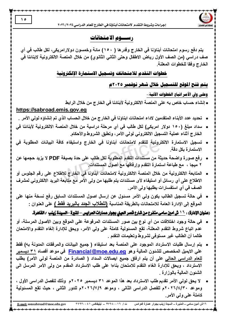 حددت وزارة التربية والتعليم والتعليم الفني، رسوم وخطوات التقدم لامتحانات أبناؤنا في الخارج للعام الدراسي ٢٠٢٥/ ٢٠٢٦.