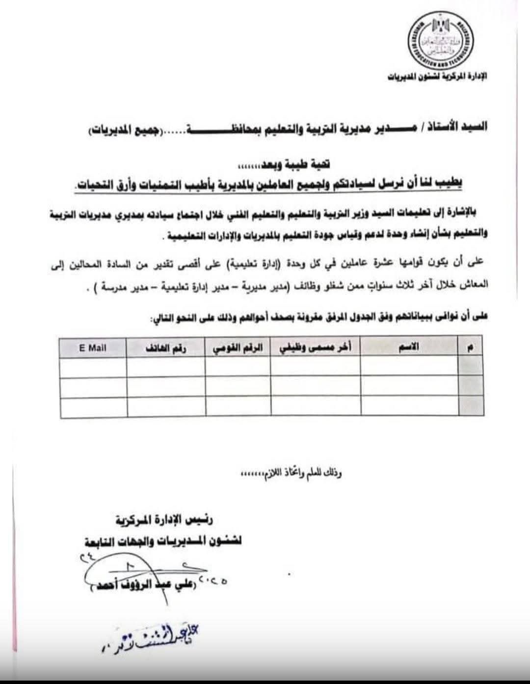 وشددت على ضرورة أن يكون قوامها عشرة عاملين في كل وحدة على أقصى تقدير من المحالين إلى المعاش خلال آخر ثلاث سنوات ممن شغلو وظائف مدير مديرية، مدير إدارة تعليمية_ مدير مدرسة.