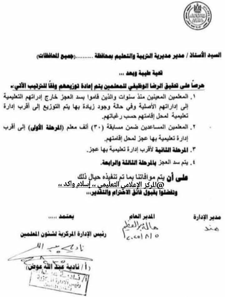 • المعلمين المساعدين ضمن مسابقة (۳۰) ألف معلم (المرحلة الأولى إلى أقرب إدارة تعليمية بها عجز المحل إقامتهم.