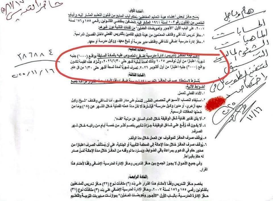 - قيمة حافز تدريس / إدارة مدرسية إضافي) المنصوص عليه بالمادة السابقة بواقع (١٠٠٠) جنيه شهريا، اعتبارا من أول نوفمبر ٢٠٢٥ وذلك لمدة ثمانية أشهر حتى ٢٠٢٦/٦/٣٠، وتزاد هذه القيمة لتكون بواقع (۲۰۰۰) جنيه اعتبارا من أول أكتوبر ٢٠٢٦، تصرف شهريا لمدة تسعة أشهر حتى ٦/٣٠ من كل عام.