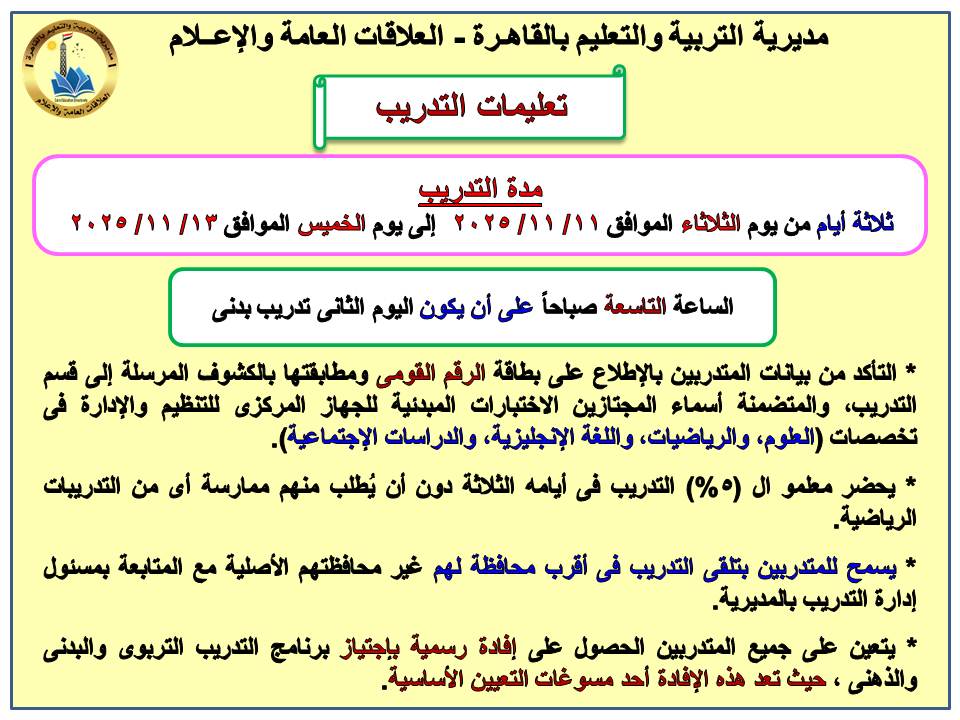 ويعقد التدريب على مدار ثلاثة أيام اعتبارًا من يوم الثلاثاء الموافق ٢٠٢٥/١١/١١ إلى يوم الخميس الموافق ٢٠٢٥/١١/١٣ فى تمام الساعة التاسعة صباحًا.