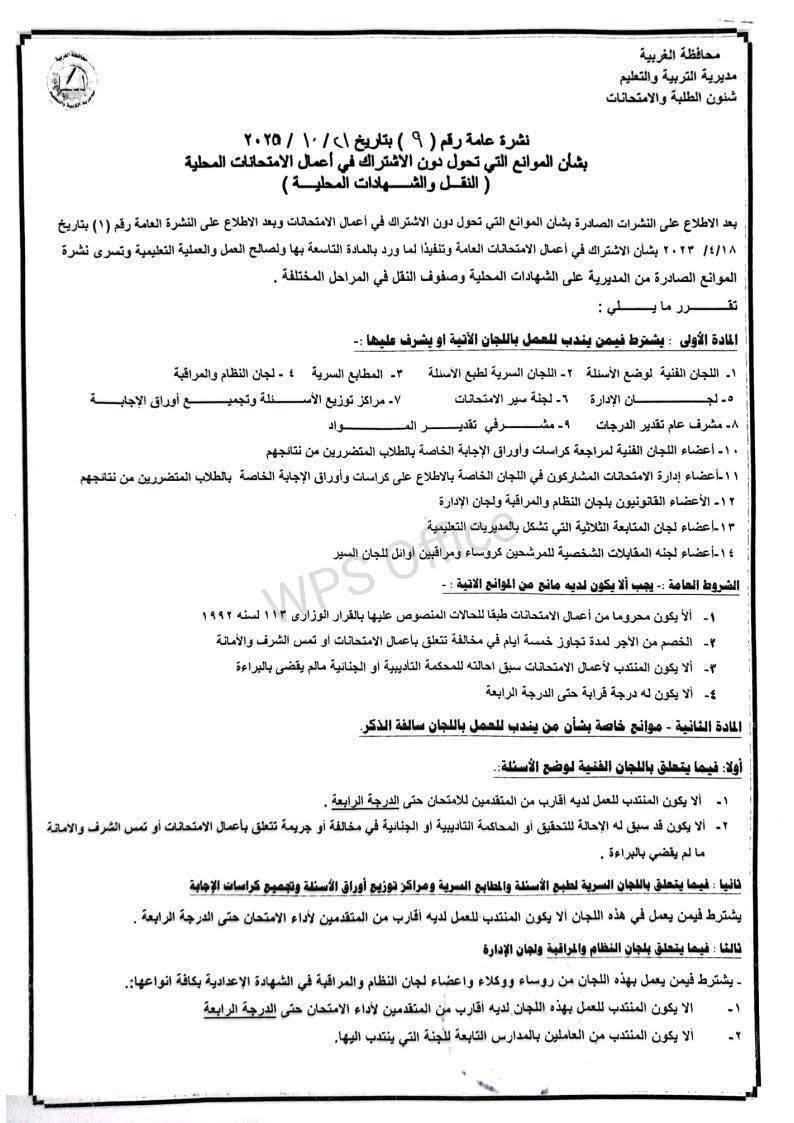 موانع الاشتراك في أعمال امتحانات النقل والشهادة الإعدادية