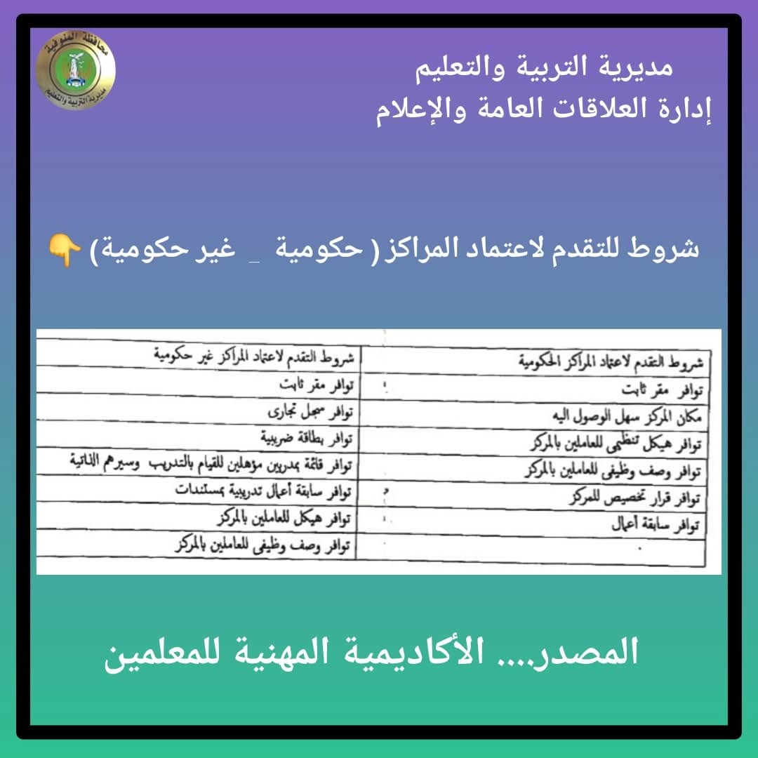 أعلنت الأكاديمية عن فتح باب التقديم لاعتماد المراكز التدريبية (الحكومية والخاصة)، وذلك وفقًا للشروط والإجراءات والمعايير المعتمدة من مجلس إدارة الأكاديمية المهنية للمعلمين.