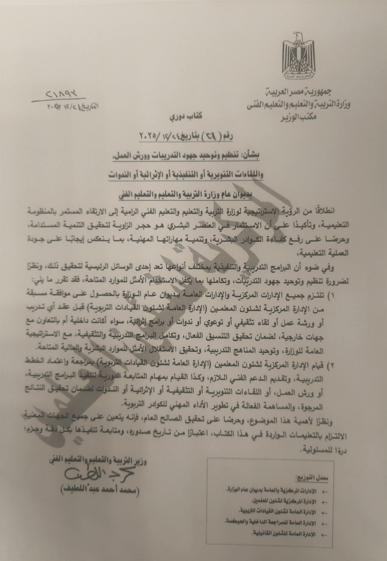 أوضحت وزارة التربية والتعليم والتعليم الفني، أنه انطلاقا من رؤيتها الاستراتيجية، للارتقاء المستمر بالمنظومة التعليمية، وتأكيدًا على أن الاستثمار في العنصر البشري هو حجر الزاوية لتحقيق التنمية المستدامة، تقرر ما يلي: