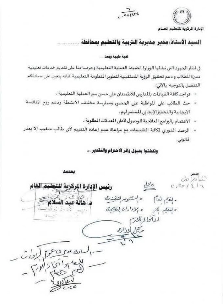 وأوضحت أنه في إطار جهودها لضبط العملية التعليمية وحرصا منا على تقديم خدمات تعليمية مميزة للطلاب ودعم تحقيق الرؤية المستقبلية لتطوير المنظومة التعليمية فانه يتعين تنفيذ الآتي: