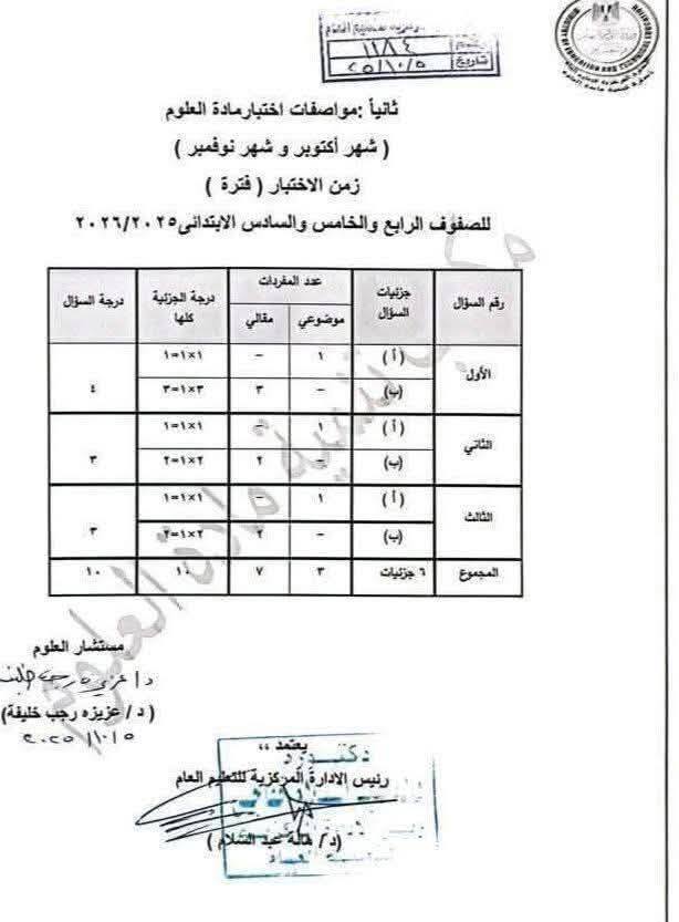 مواصفات امتحان شهر أكتوبر 2025 بمادة العلوم لطلاب الأول والثاني الإعدادي