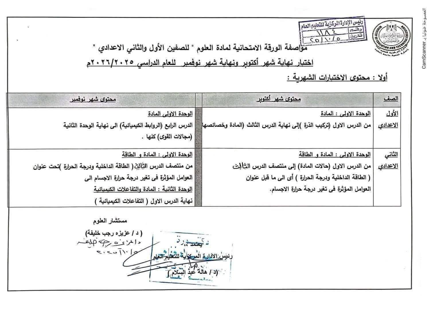 أما عن مقرر امتحان شهر أكتوبر 2025 لطلاب الأول والثاني الإعدادي بمادة العلوم فيتضمن الآتي: