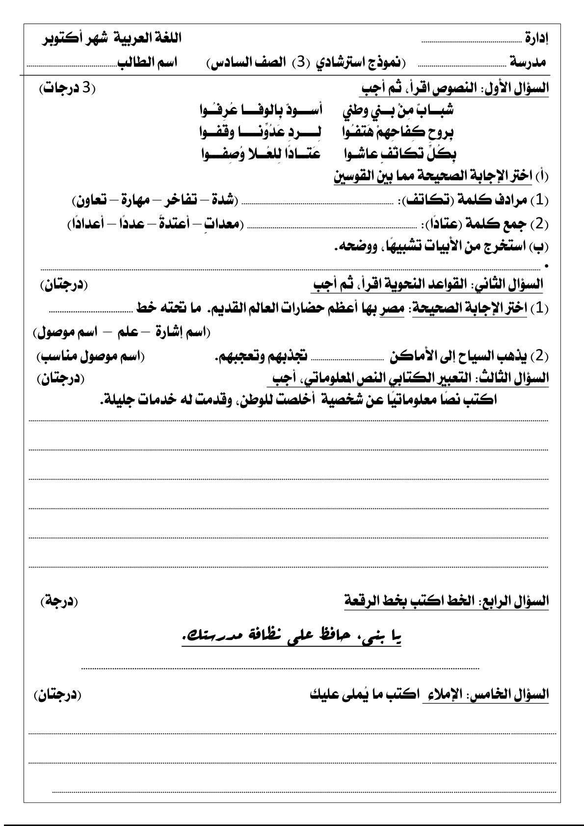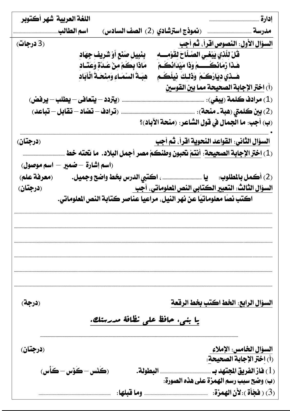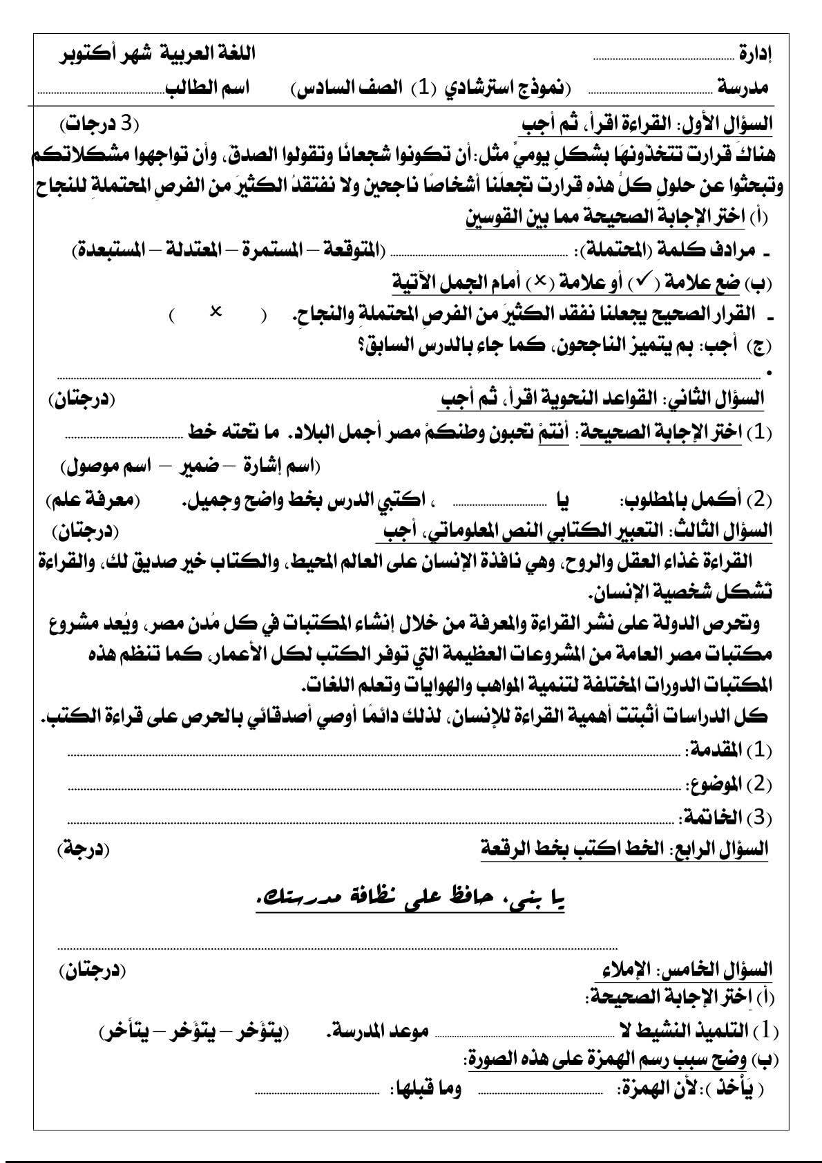 ويمكن الحصول على نماذج امتحانات شهر أكتوبر 2025 بمادة اللغة العربية للصف السادس الابتدائي من خلال مطالعة الصور التالية:
