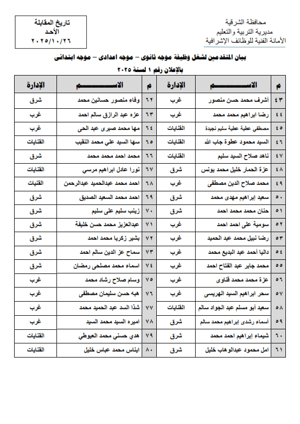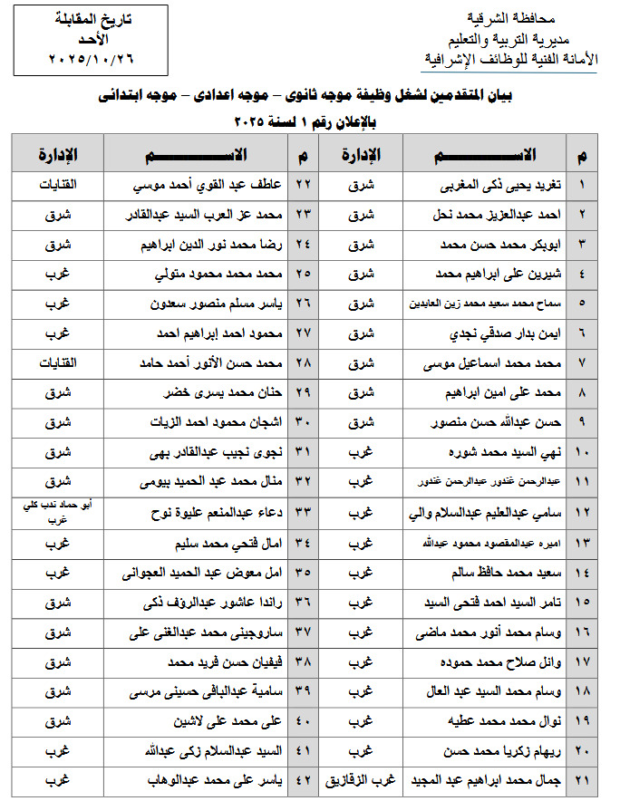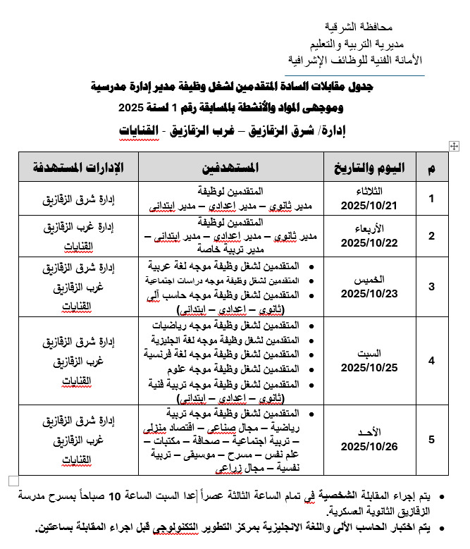 وأهابت مديرية التربية والتعليم بالشرقية، بالمتقدمين لشغل هذه الوظائف الحضور في المواعيد المحددة يوم الاحد 26 أكتوبر 2025 بمركز التطوير التكنولوجي بالمديرية لإجراء اختبار اللغة الانجليزية والحاسب الآلي ثم التوجه لمسرح مدرسة الزقازيق الثانوية العسكرية في تمام الساعة الثالثة بعد الظهر لحضور اختبارات المقابلة الشخصية طبقا للكشف رقم 1 ورقم 2 المنشور.