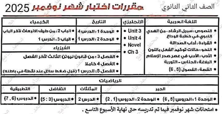 مقررات اختبار شهر نوفمبر 2025 لطلاب الصف الثاني الثانوي علمي