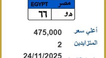 سجل المزاد حتى الآن 900 ألف جنيه على اللوحة التي تحمل رقم (د ه ب 9) وتزايد علي اللوحة 3 أشخاص حتى الآن، ومن المقرر انتهاء المزايدة على اللوحة في 23 نوفمبر.