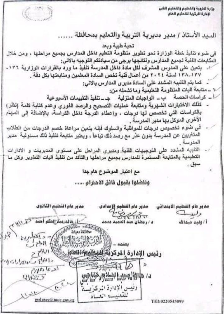 وأشارت إلى أنه يتعين على المدرس المشرف لكل مادة داخل المدرسة تنفيذ ما ورد بالقرارات الوزارية ١٣٦ ١٣٧-١٣٨ لسنة ۲۰۲٤ من أعمال فنية تخص المعلمين ومتابعتها بكل دقة.