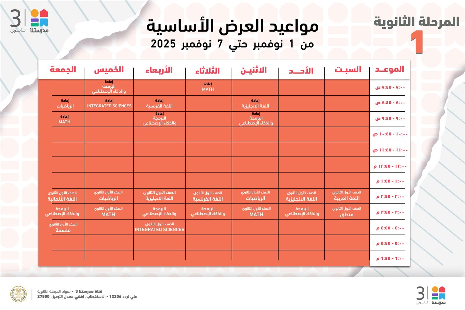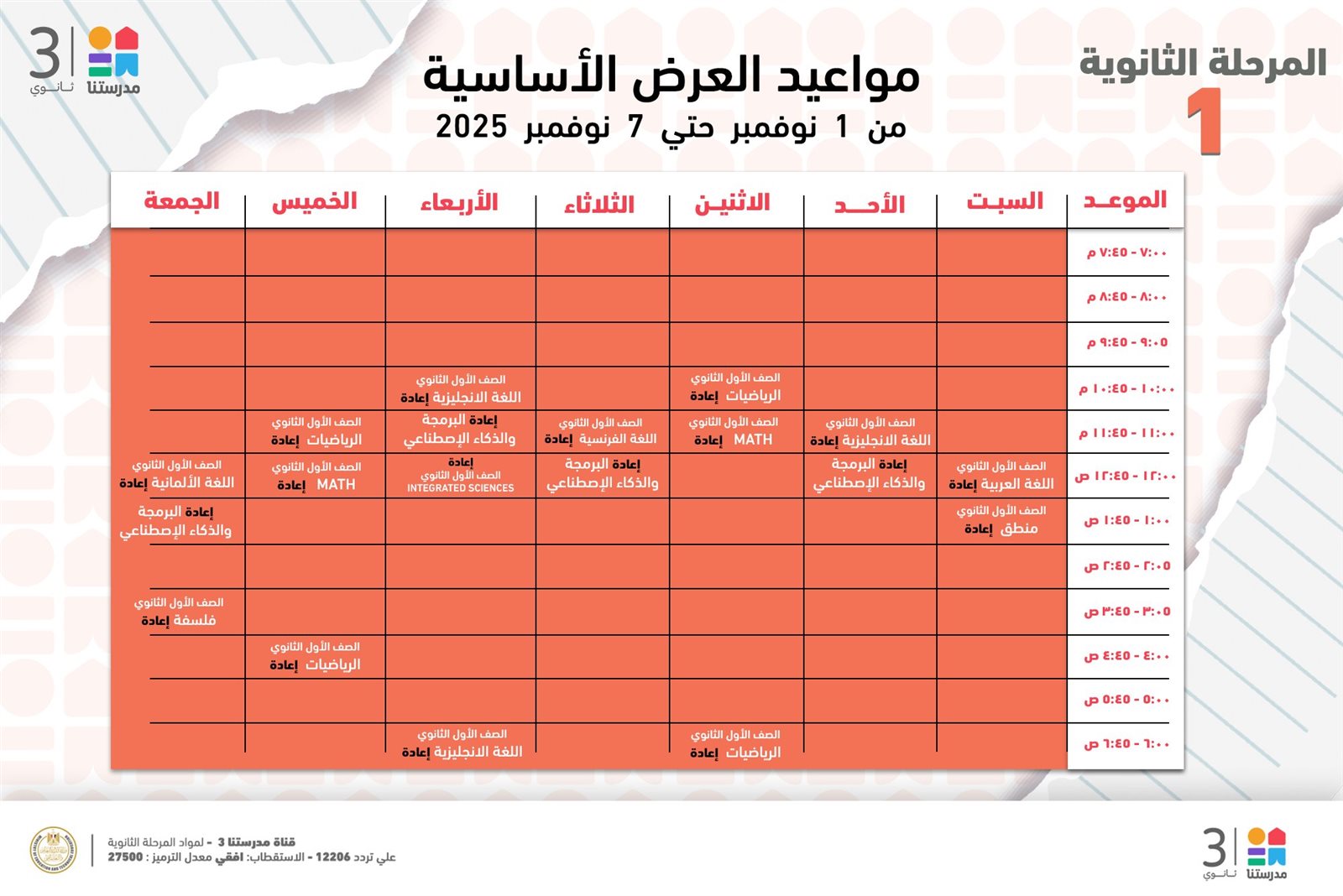 ويمكن معرفة مواعيد بث دروس المرحلة الثانوية على قناة مدرستنا 3 من خلال مطالعة الصور التالية: