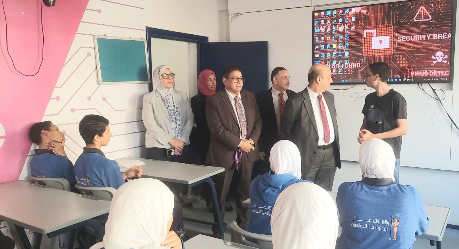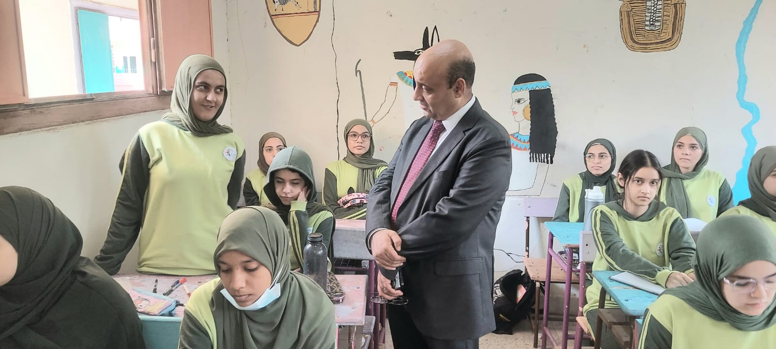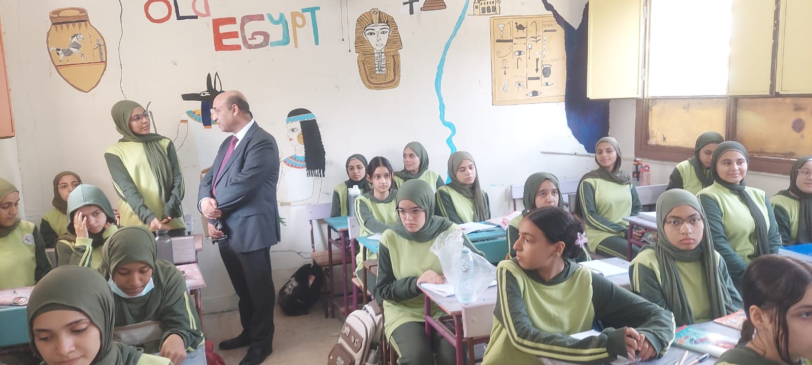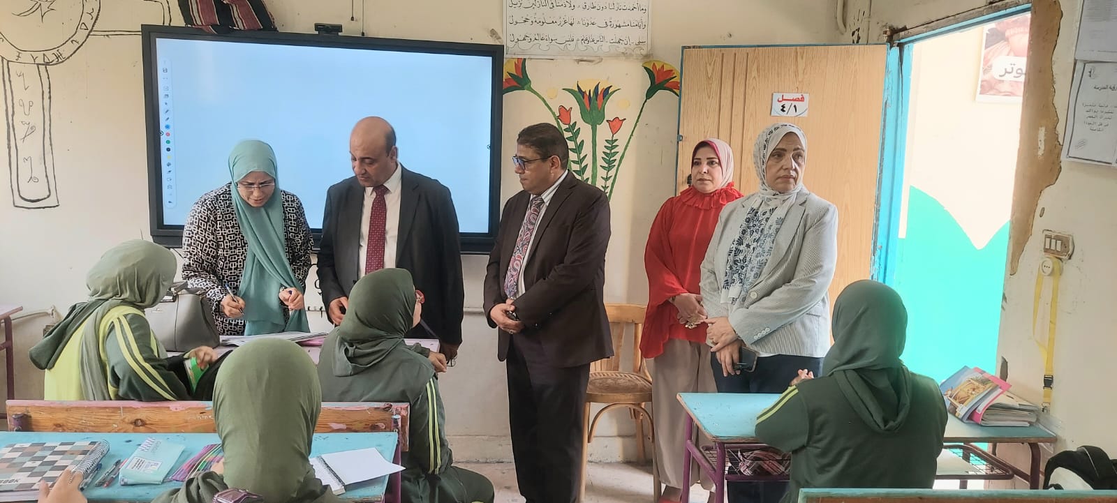 وخلال الزيارة تم متابعة دفتر الحضور والانصراف، انتظام سير العملية التعليمية داخل الفصول المختلفة، والإلتزام بالتعليمات الوزارية الخاصة بتقليل الكثافات الطلابية من خلال متابعة القوائم بكافة الفصول بالاضافة إلى متابعة المعلمين بالحصة.