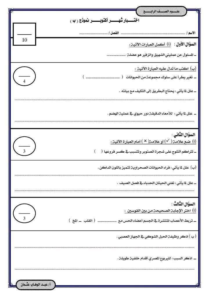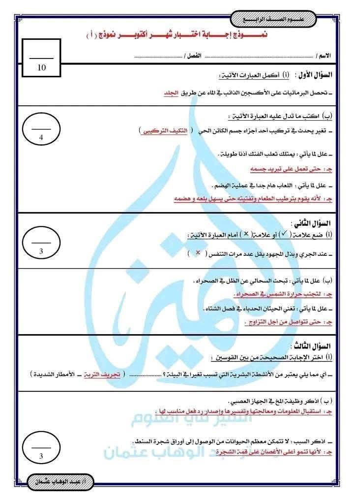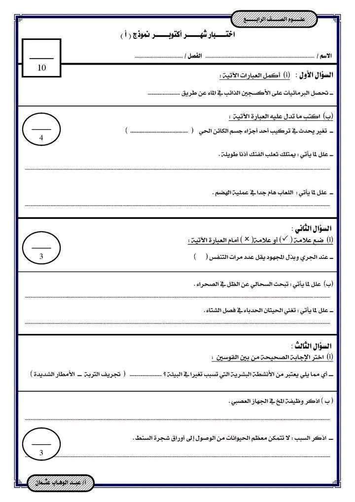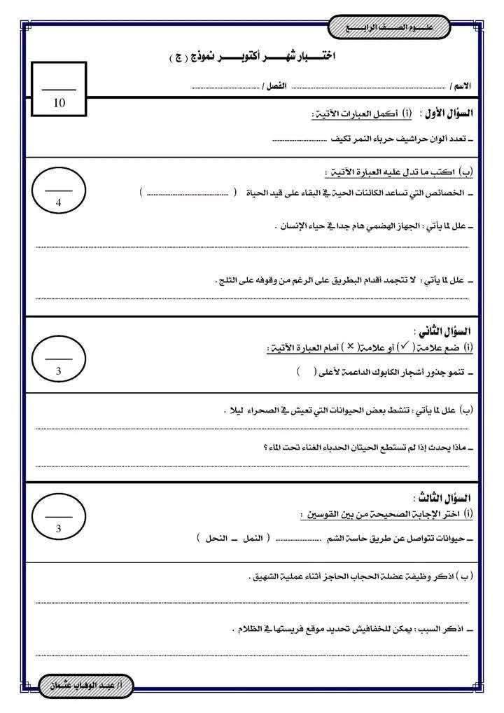 ويمكن الحصول على نماذج امتحانات شهر أكتوبر 2025 بمادة العلوم لـ الصف الرابع الابتدائي من خلال مطالعة الصور التالية: