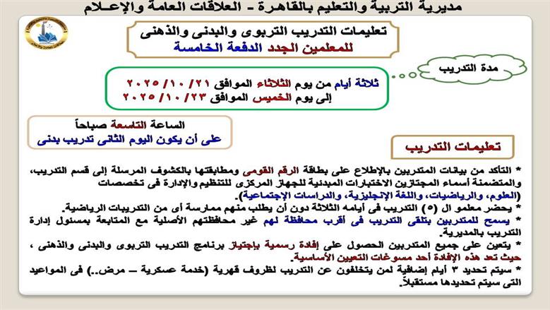 وأوضحت المديرية أن التدريب سيُعقد وفقًا للجداول الزمنية المحددة، على مدار ثلاثة أيام متتالية، تبدأ من يوم الثلاثاء الموافق 21 أكتوبر وتستمر حتى الخميس 23 أكتوبر، وذلك اعتبارًا من الساعة التاسعة صباحًا يوميًا.