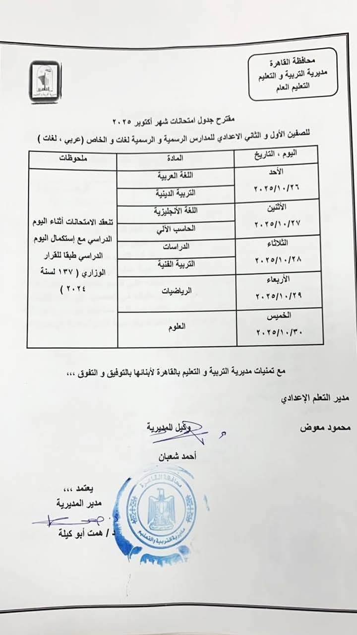 ننشر جدول امتحانات شهر أكتوبر 2025 محافظة القاهرة