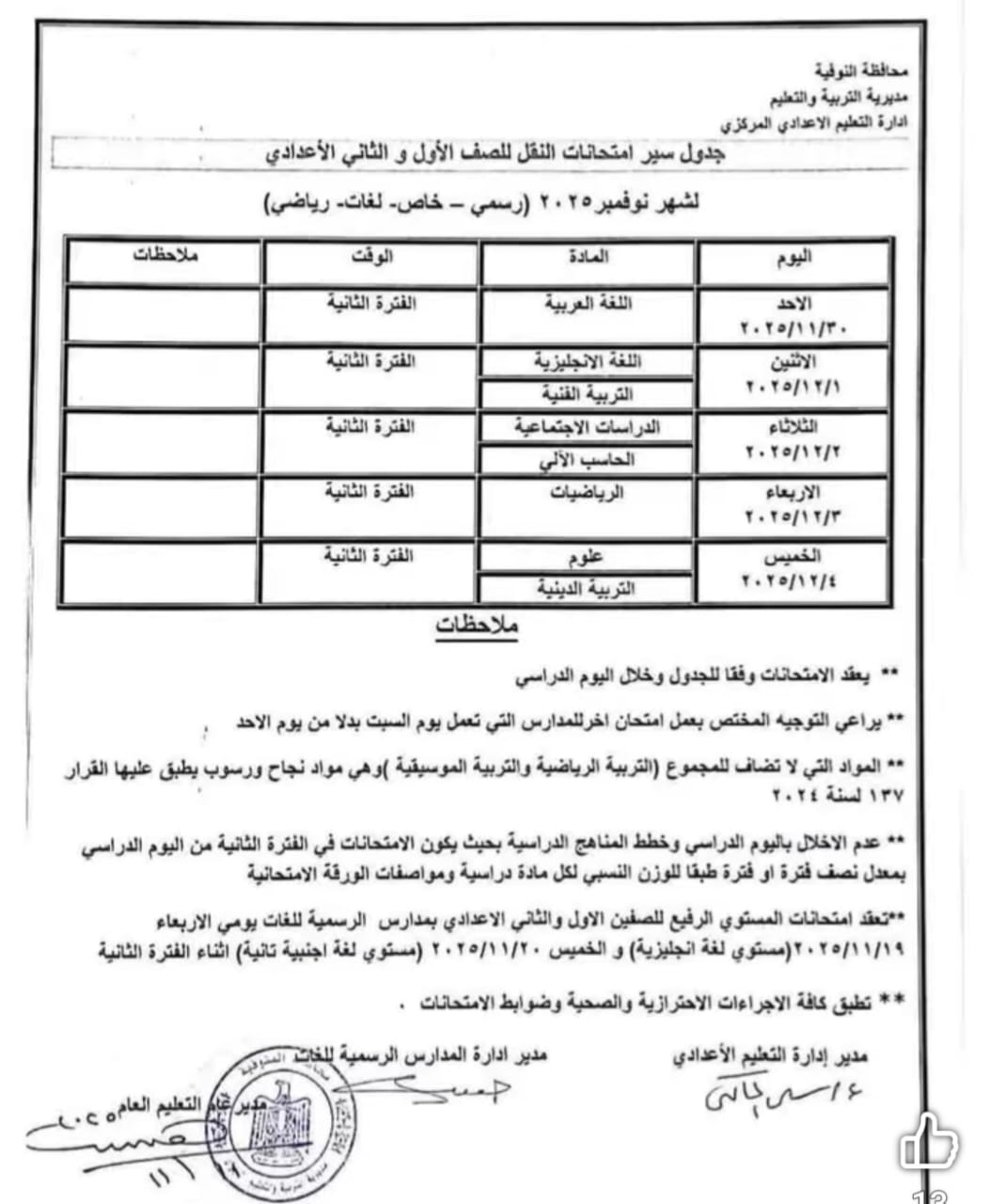 جدول امتحانات شهر نوفمبر 2025 جميع المراحل محافظة المنوفية