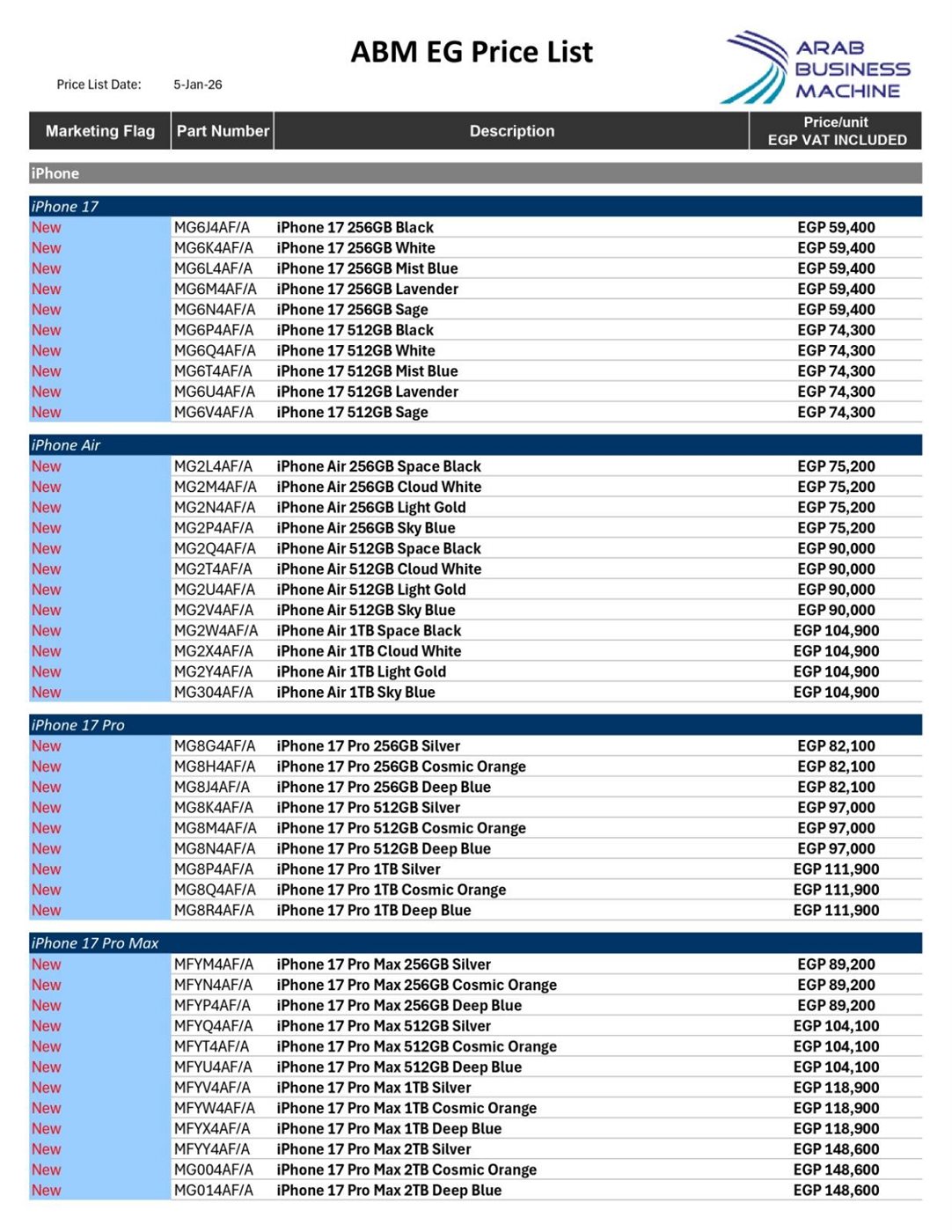 - آيفون 17 إير سعة 256 جيجابايت: قرابة 75 ألف جنيه